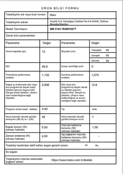 Beko BM 3143 3 Programlı Bulaşık Makinesi
