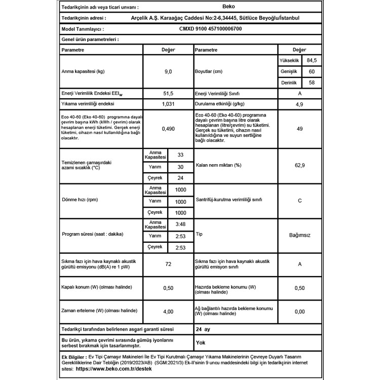 Beko CMXD 9100 9 Kg Çamaşır Makinesi