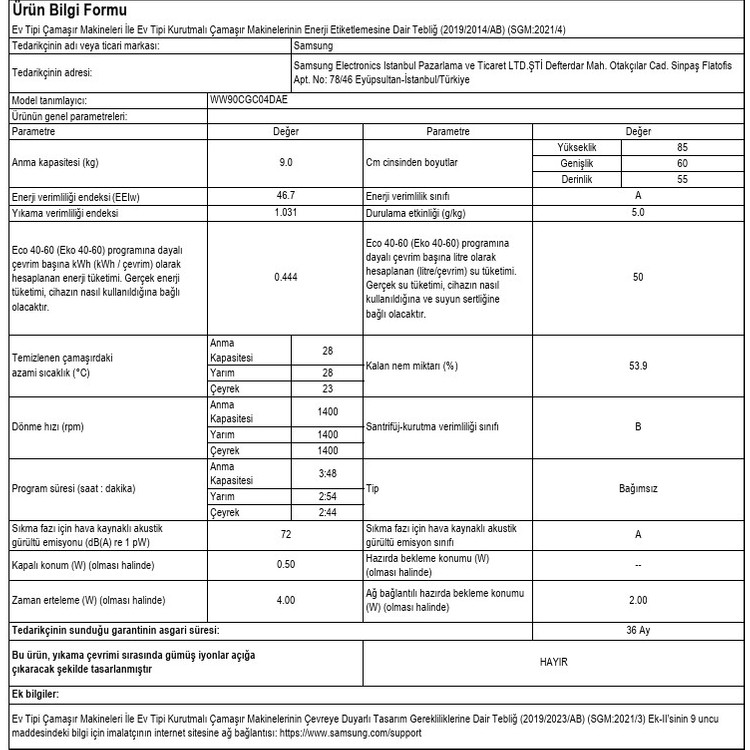 Samsung WW90CGC04DAEAH 9 Kg 1400 devir Çamaşır Makinesi, Dahili Wi-Fi, Eco Bubble Yıkama Teknolojisi
